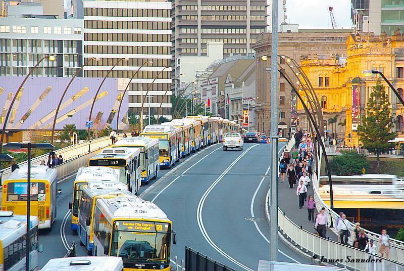 Massive bus traffic jam in Brisbane, Australia illustrate problem of fitting “BRT” into a high-capacity application. Photo: James Saunders.