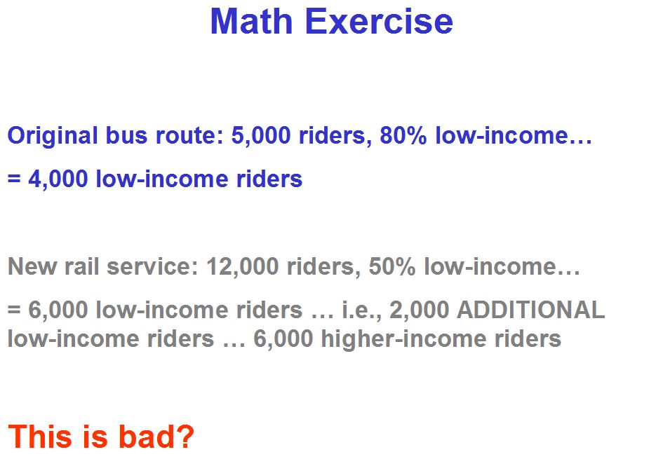 “Math exercise” challenges claim rail transit has class/ethnic bias, based on demographic percentage. Since rail attracts more, and more diverse, ridership, average income rises, but so does lower-income and minority ridership!