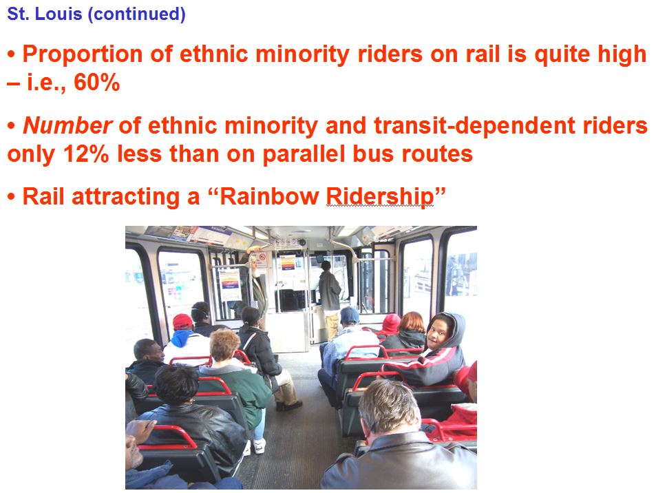St. Louis is one example for which study data was available. Metrolink light rail transit system has attracted a more diverse ridership than bus system.