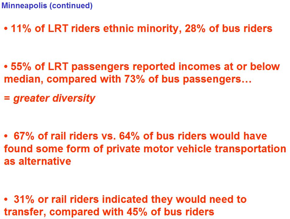 In reality, rail systems appear to attract a far more diverse ridership, particularly with respect to ethnic background and income level, than do typical bus services. Inevitably, this implies that, for a given rail service in a specific corridor, a proportionately higher number of white/anglo and more affluent passengers will be attracted – even if the number of nonwhite, lower-income, and transit-dependent riders is equal to, or greater than, what would otherwise by carried by bus operations in the corridor.